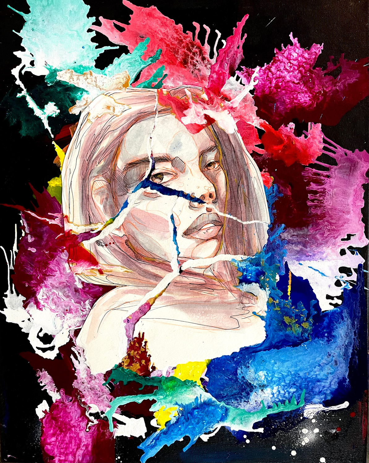 "During my time at YYGS I made many friends, and had memorable conversations with people from around the world. This piece is titled Hyperfixations of Ephemeral Memories, and it represents how people reanimate old memories into a form of escapism. The bursts of color present the spontaneity of this feeling, and how it differs through the lens of each person."